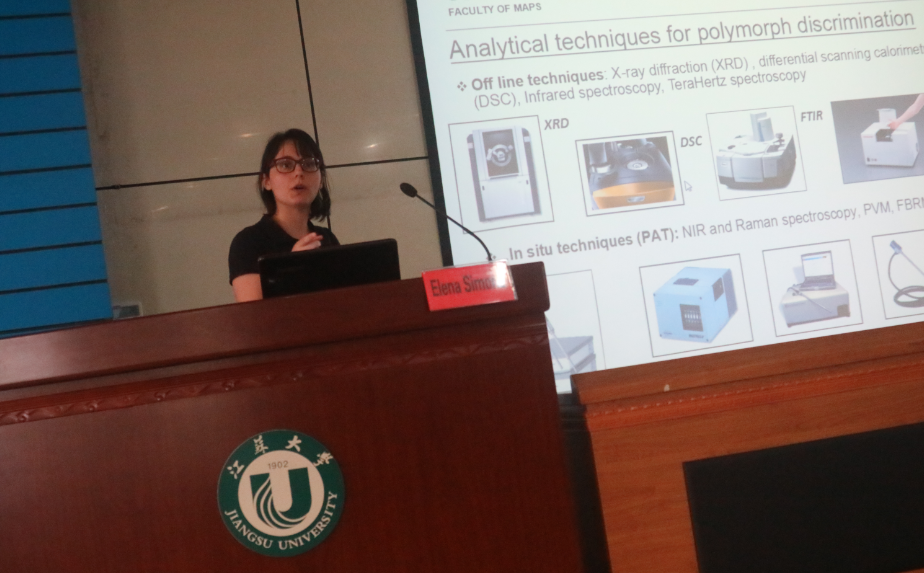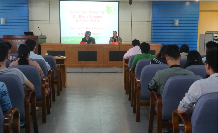 On Apr. 19, Dr. Elena Simone from the University of Leeds visited Jiangsu University. Dr. Simone delivered an academic lecture named Application of process analytical technology (PAT) tools for the better understanding and control of crystallisation processes. Prof. Huang Xingyi, vice-Dean of School of Food and Biological Engineering, and some faculty members and students of the school attended the lecture. Introduction to Dr. Elena Simone: Dr. Elena Simone comes from the School of Food Science and Nutrition, University of Leeds. She received her Master degree in Chemical Engineering from University of Pisa, Italy and her PhD degree in Hemical Engineering, Loughborough University, UK. Then Dr. Elena Simone worked as visiting scholar at Purdue University, School of Chemical Engineering, West Lafayette, US. Her Research Interests: 1.Understanding the phenomena of polymorphism, nucleation and crystal growth of pharmaceuticals and food crystals (e.g. fats, sugars) using on-line, in situ, analytical techniques as well as off-line solid state characterisation;2. Developing strategies to effectively control crystal size, shape and polymorphism during crystallisation processes, combining experimental and modelling work.