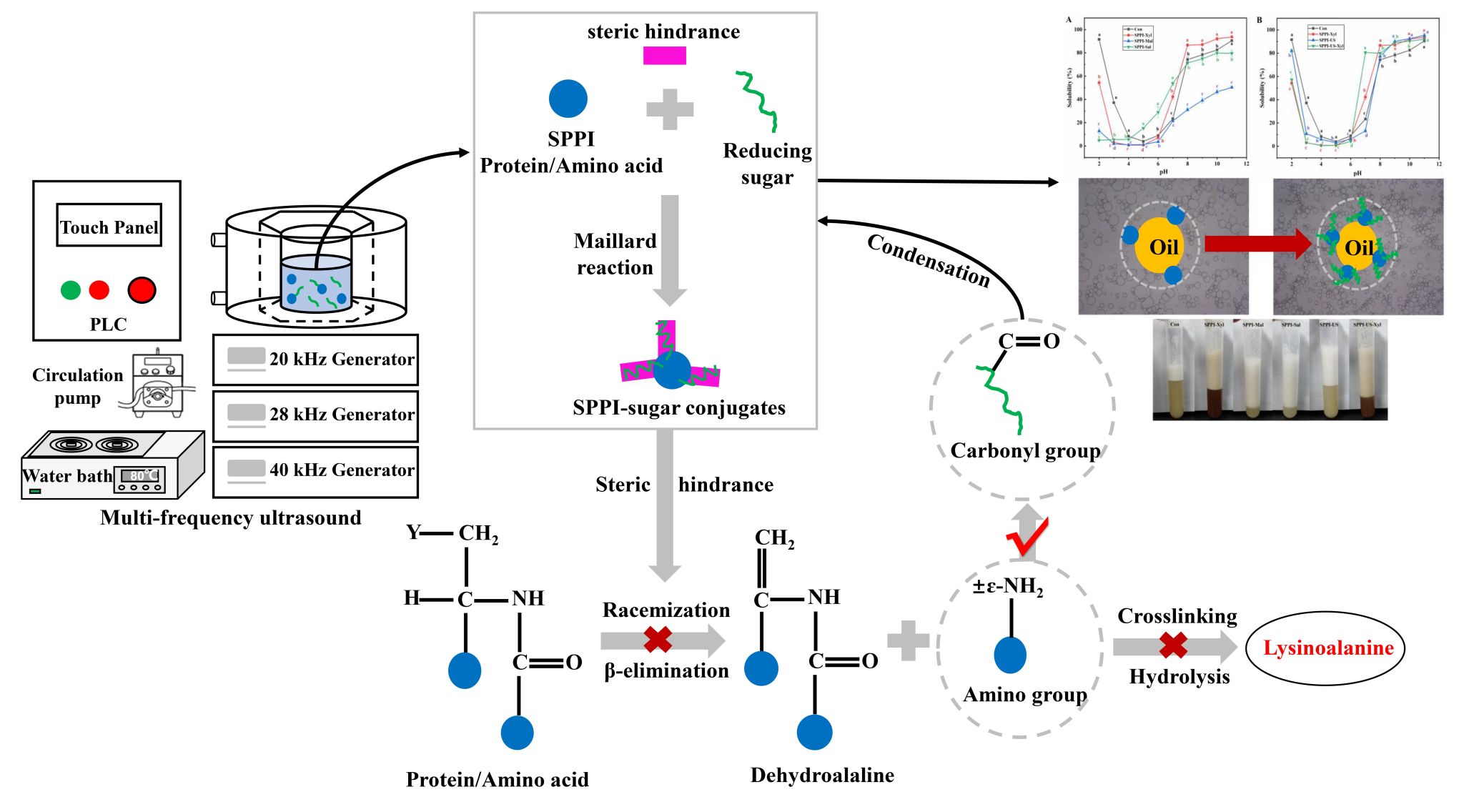 本文利用糖基化和超声的手段抑制赖丙氨酸的生成并显著提升了蚕蛹蛋白的功能特性。通过三种不同分子量的糖与蚕蛹蛋白复合,并通过超声辅助处理,探究不同复合物的共价/非共价交联方式,化学键的键合方式,宏观微观构象变化,糖基化羰氨缩合效应和大分子空间位阻效应等对蚕蛹蛋白功能性提升和对赖丙氨酸生成的抑制机理。