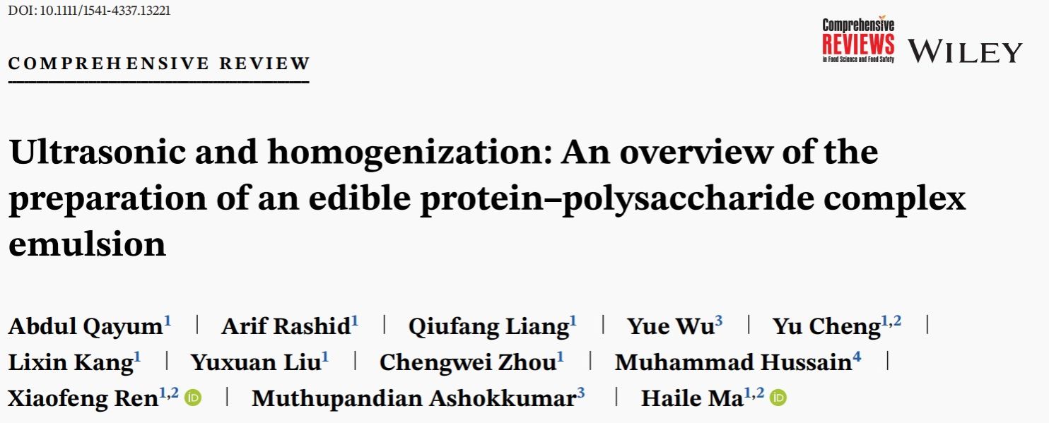 任晓锋教授课题组在国际食品安全和营养领域顶级期刊《Comprehensive Reviews in Food Science and Food Safety》(Q1,IF=14.8)在线发表了的最新研究成果——“Ultrasonic and homogenization: An overview of the preparation of an edible protein–polysaccharide complex emulsion”(DOI: 10.1111/1541-4337.13221)。5G影院