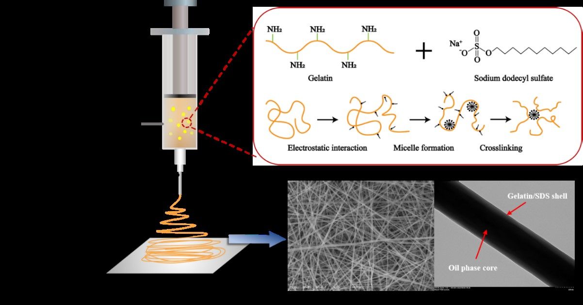 为了减少合成材料所带来的各种食品安全以及环境污染问题,应用GRAS食品级生物聚合物开发新型环保型材料已成为食品包装领域发展的主流方向。明胶(gelatin)是一种重要的生物材料,主要通过天然胶原蛋白水解获得。由于其成本低、生物相容性高且易于获取,已被广泛应用于食品以及制药工业。本研究利用SDS胶束交联显著改善了明胶乳液的理化性能,并通过乳液静电纺丝技术开发了一种核壳结构纳米纤维载体的连续成型方法。该方法可有效解决明胶前驱体液连续可纺性能差,制备纳米纤维结构不稳定等问题,为可降解纳米载体材料的开发提供了思路。该载体体系有望在活性食品包装,医用敷料,生物工程等领域进一步推广应用。