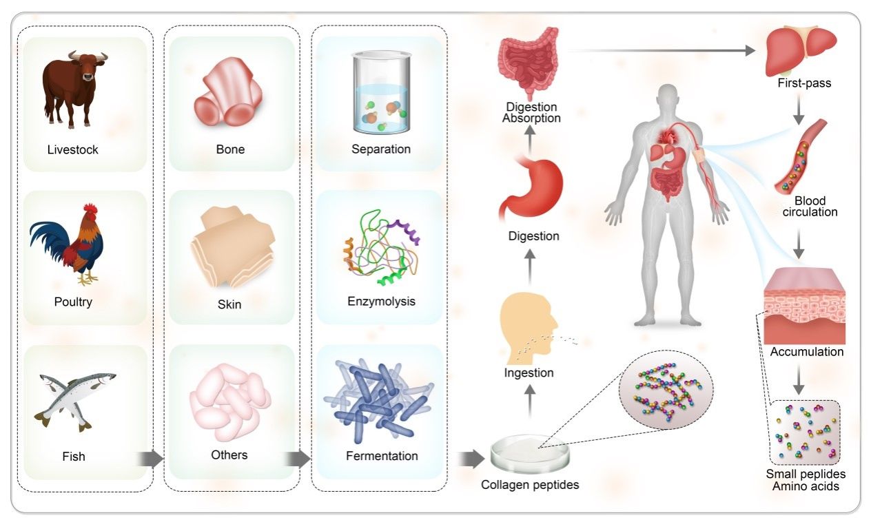 图1 食源性胶原蛋白肽的来源、制备和代谢过程