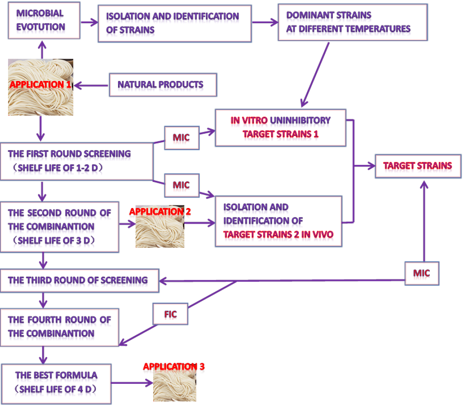 微生物的快速生长以及微生物菌群演替是生鲜面贮藏的显著特征之一,导致生鲜面的优势腐败菌随温度的变化而存在差异。研究发现生鲜面中属水平微生物菌群演替规律为:由不动杆菌属(4 ℃)转变为泛生菌属和芽孢杆菌属(15 ℃),再到芽孢杆菌属和泛生菌属(25 ℃),最后到芽孢杆菌属和葡萄球菌属(37 ℃)。对生鲜面中优势菌株的分离鉴定,在种水平上也表现出相似的进化过程。鉴于优势菌的差异对面条保质期的影响,我们设计了一种新策略,通过准确定位靶标菌株来开发生鲜面保鲜剂。