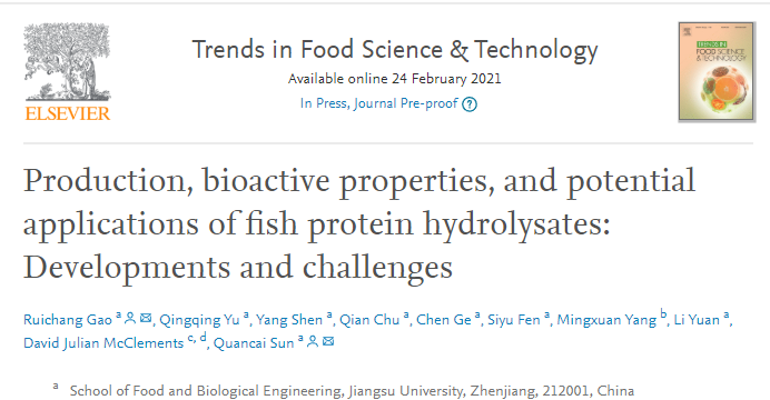 高瑞昌教授团队标题为“Production, bioactive properties, and potential applications of fish protein hydrolysates: Developments and challenges”(鱼蛋白水解物的生产、生物活性和潜在应用:发展与挑战)的综述文章在国际食品领域TOP期刊(No.1)《Trends in Food Science & Technology》在线发表(//doi.org/10.1016/j.tifs.2021.02.031)。5G影院