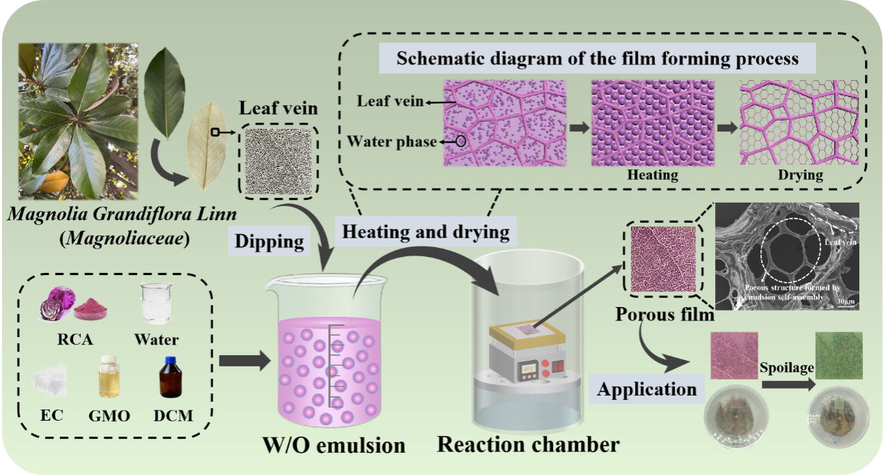 该研究提出利用多孔的植物叶脉作为成膜支架,通过油包水(W/O)乳液将亲水的花青素引入疏水材料中,开发了一种稳定且高灵敏度的多孔新鲜度指示膜。首先,将花青素(水相)封装在乙基纤维素(EC)−二氯甲烷(DCM)有机相中,形成W/O乳液。然后,将该乳液浸涂在叶脉上,立即在一定温湿度下加热并固化成膜。所得结果表明,该指示膜具有良好的气敏性和稳定性。在肉品新鲜度监测的应用中,指示膜产生从粉色到绿色的颜色变化。此外,该薄膜的开发采用了安全、低成本的材料,并且可以完全生物降解。
