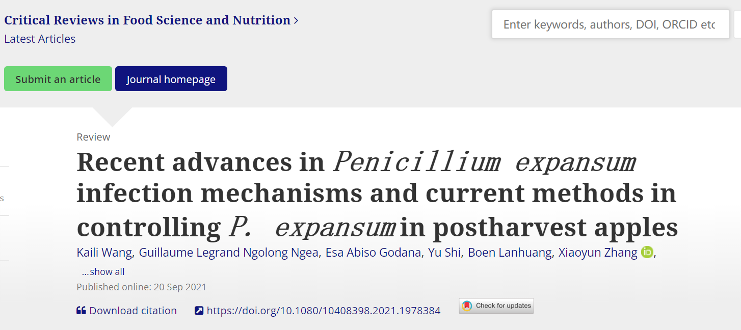 张红印教授在国际食品领域顶级期刊CriticalReviews in Food Science and Nutrition(IF 11.176)在线发表题为“Recent advances inPenicillium expansuminfection mechanisms and current methods in controllingP. expansumin postharvest apples”的综述(//doi.org/10.1080/10408398.2021.1978384),系统阐述了扩展青霉侵染苹果的分子机制及其防治策略方面的最新研究进展。该成果已被《食品科学》公众号(//mp.weixin.qq.com/s/QBqj537ULx_Fqoum3V7PvA)推送,并被食品科学网(//www.chnfood.cn/7293.html)、新浪微博等媒体广泛报道,产生了较大的学术影响。本文的第一作者为5G影院