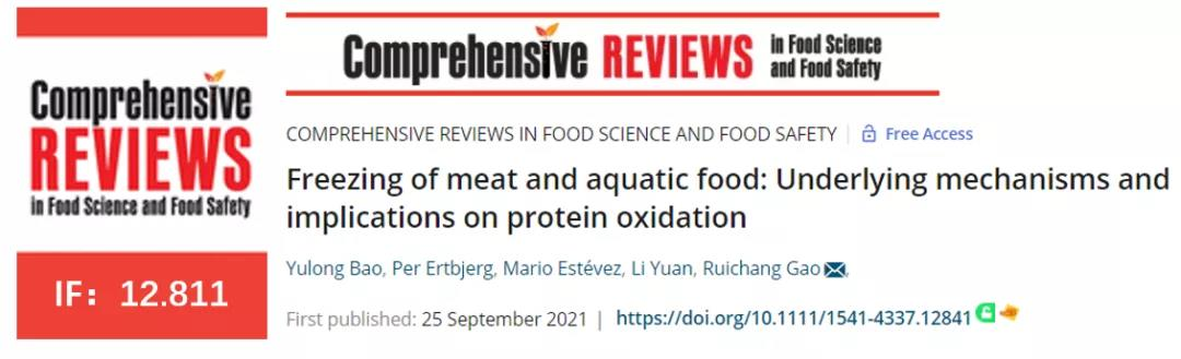 近日,我院高瑞昌教授水产科学与健康创新课题组标题为“Freezing of meat and aquatic food: Underlying mechanisms and implications on protein oxidation”的综述文章在国际食品领域TOP期刊《Comprehensive Reviews in Food Science and Food Safety》(IF:12.811)在线发表(//doi.org/10.1111/1541-4337.12841)。