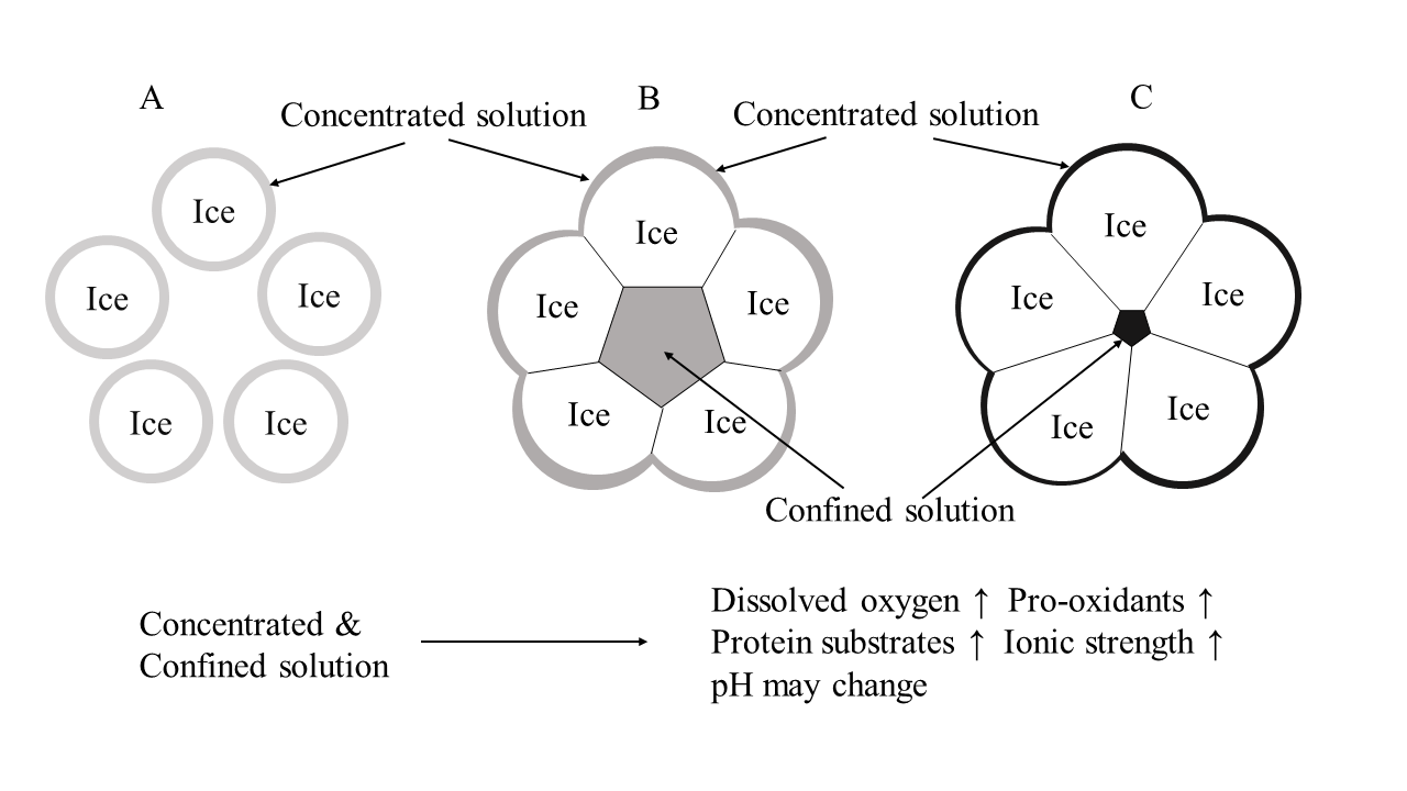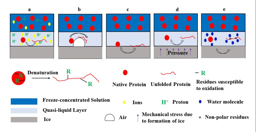 图3冰水界面对于蛋白变性和氧化的影响机理示意图