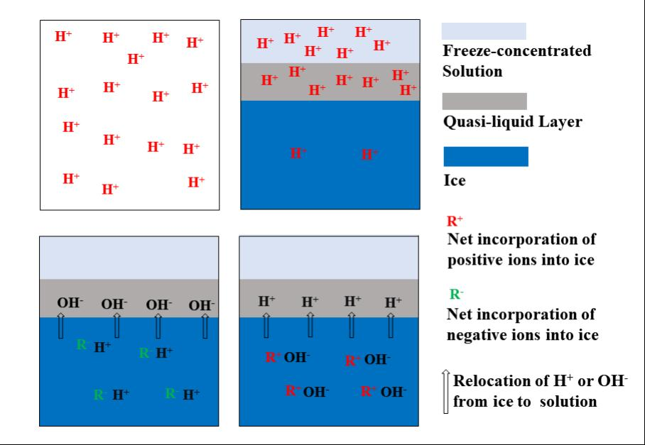 图4冷冻电势的形成及其对微环境pH影响机制示意图